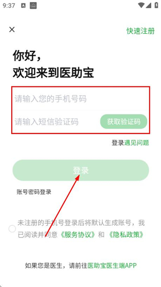 3、在登录页面填写手机号和验证码,勾选协议后,点击登录完成账号登录操作。