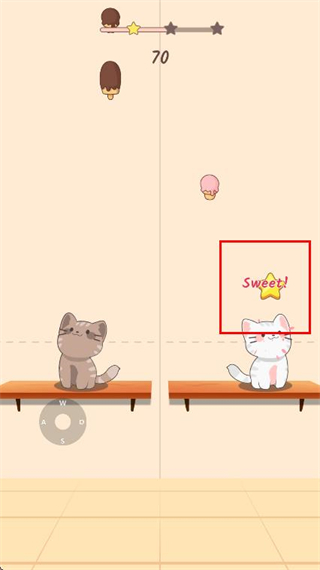 1、在游戏内,控制猫咪接住落下的甜品,获取分数。