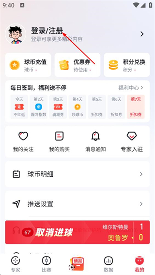 3、在个人页面,点击登录/注册的选项,进入球讯登录页面。