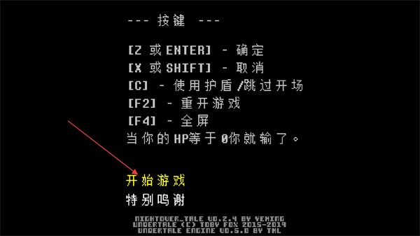 1、这是游戏的按键说明界面,如Z键或ENTER键对应确定等等介绍,熟悉这些按键后点击开始游戏即可进入游戏。