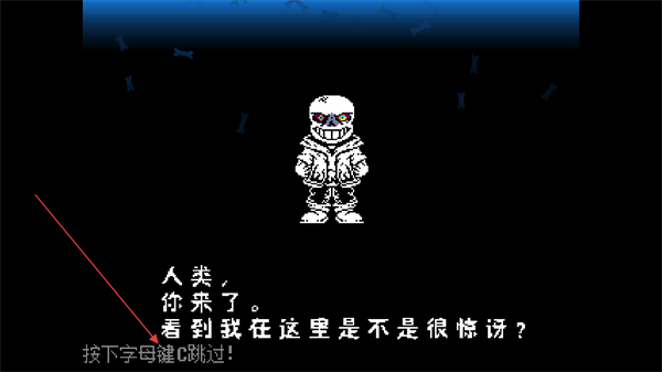 3、这是游戏的剧情对话界面,界面显示角色对话内容,同时提示按下字母键C跳过,按C键可快速跳过对话推进剧情。