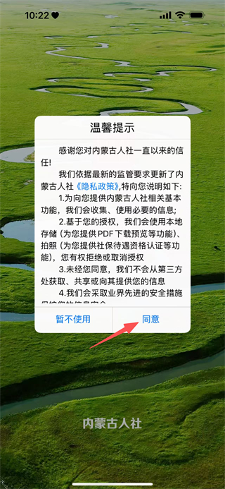 1、在内蒙古人社的温馨提示弹窗中,点击同意,进入应用。