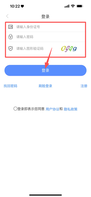 4、在登录页面,填写身份证、密码跟图形验证码,点击登录,完成账号登录。
