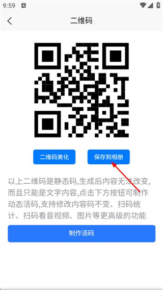 3、在生成的二维码页面,点击保存到相册按钮,将二维码保存至手机相册。