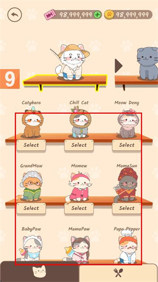 2、利用内置菜单,点击按钮,解锁全猫咪角色,自由选择搭配。
