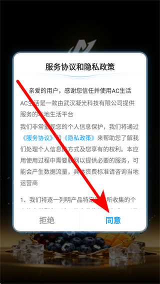 1、打开AC生活app后,出现服务协议和隐私政策弹窗,点击同意继续。