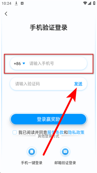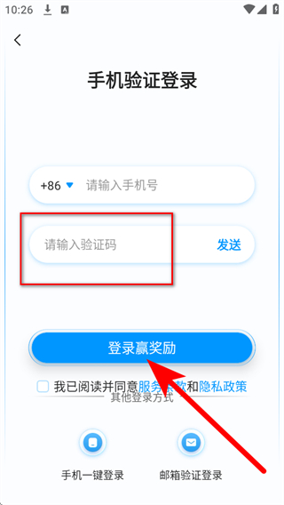 4、在请输入验证码输入框填写收到的验证码,勾选我已阅读并同意服务条款和隐私政策后,点击登录赢奖励完成注册。