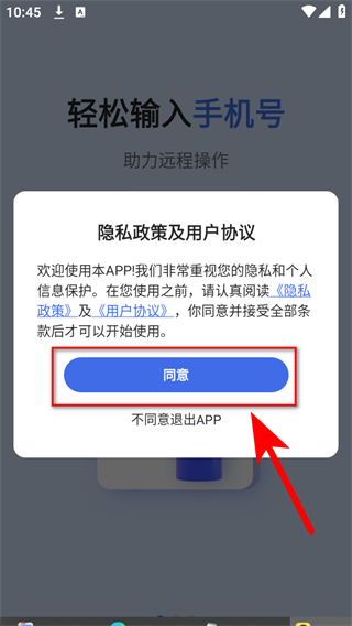 1、打开瞬马远程协助app后,出现隐私政策及用户协议弹窗,点击同意进入后续页面。