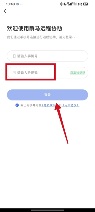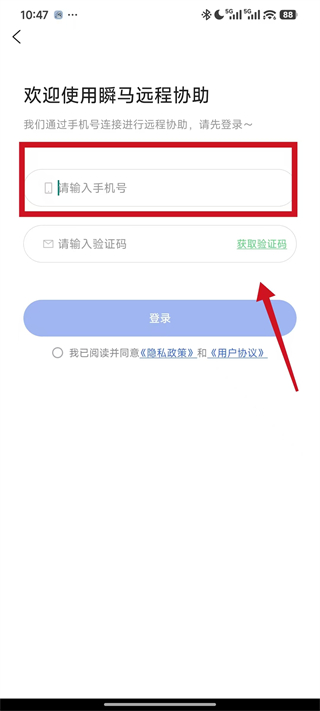 2、进入欢迎使用瞬马远程协助页面,在请输入手机号输入框填写个人手机号码,获取验证码。
