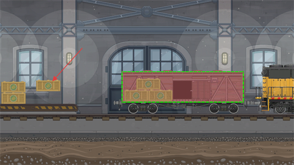1、这是列车运输任务的装车准备环节,场景为火车站台,需将红色箭头指向的带标识木箱移动至绿色框选的红色车厢内,完成货物装载的前置操作,为后续列车运输做准备。