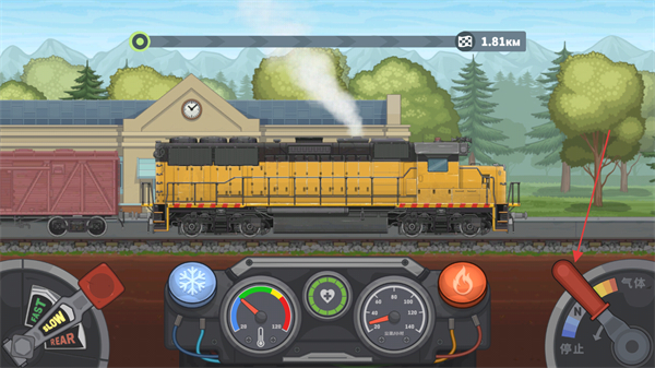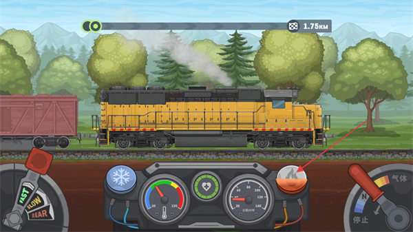 3、这是列车驾驶阶段界面,需通过红色箭头指向的气体操控杆调整列车动力,同时结合底部仪表监控状态,保障列车正常行驶。