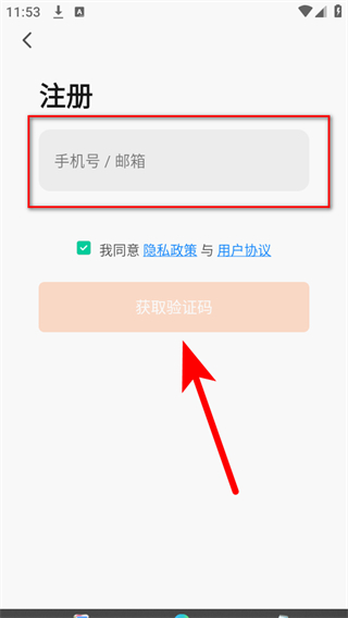 3、在注册页面的手机号/邮箱输入框填写信息,确认勾选我同意,点击获取验证码。