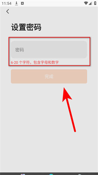 4、进入设置密码页面,在密码输入框填写符合要求的密码,点击完成。