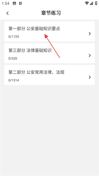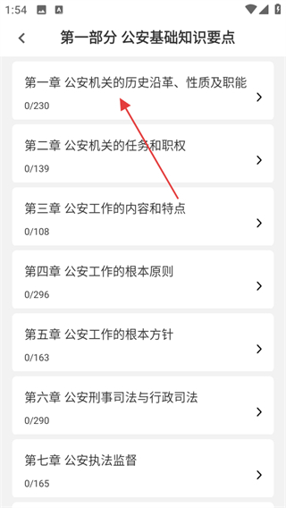 2、在分类页,选择第一部分公安基础知识要点,进入对应章节列表页。