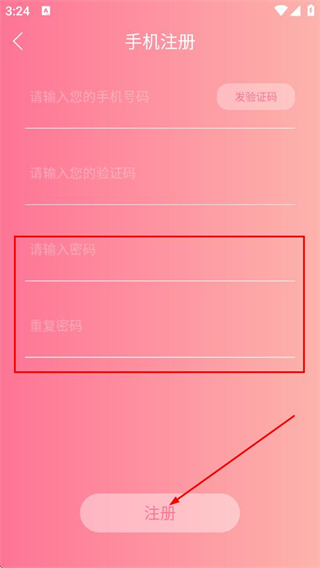 4、在注册页面,继续填写密码与重复密码,点击注册,完成账号注册。