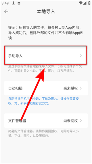 3、在本地导入页面,选择手动导入,进入文件选择界面。