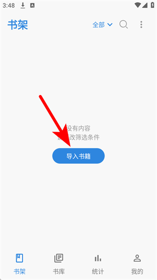 2、进入书架页面,点击页面中的导入书籍,进入书籍导入页面。