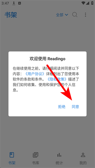 1、打开Readingo后,阅读用户协议及隐私政策后点击同意进入应用。