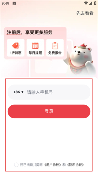 3、在登录页面,填写手机号并勾选协议后,点击登录获取验证码。