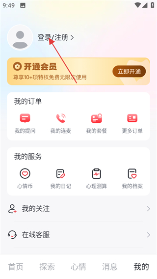 2、在个人中心页面,点击登录注册区域,进入登录页面。