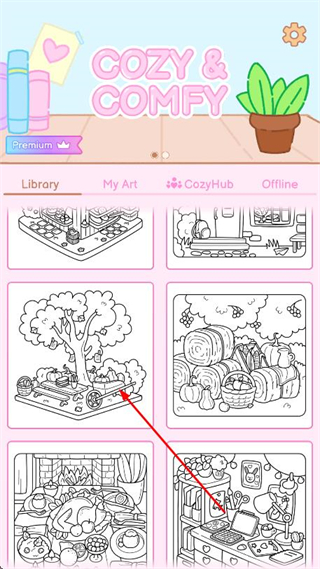 1、在主界面的场景库中,选择目标线稿,进入填色创作界面。