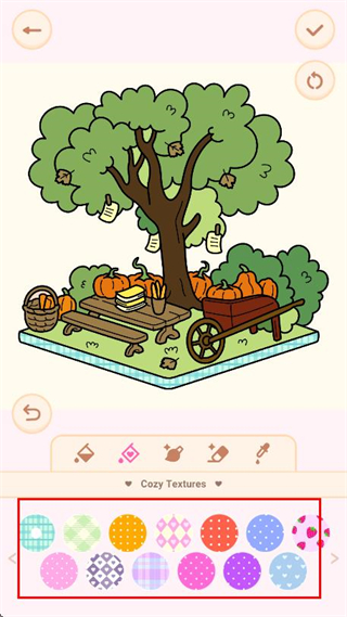 玩法涵盖基础色彩填充+纹理细节装饰,既可以用纯色打造简约温馨感,也能叠加格子、波点等纹理增加层次感,创作自由度高,适配不同审美偏好。线稿包含秋日庭院、温馨书房、厨房角落等生活场景,每幅线稿都充满治愈细节,填色过程仿佛在装扮自己的温馨小空间。提供多套调色盘,纹理面板包含格子、碎花、波点等样式,不同组合可打造活泼暖系、温柔治愈等不同风格的作品。操作仅需选色-点击填色-选纹理-覆盖区域,门槛极低,填色与纹理添加的效果即时呈现,每一步操作都能看到线稿逐渐变成温馨装饰画,成就感清晰。