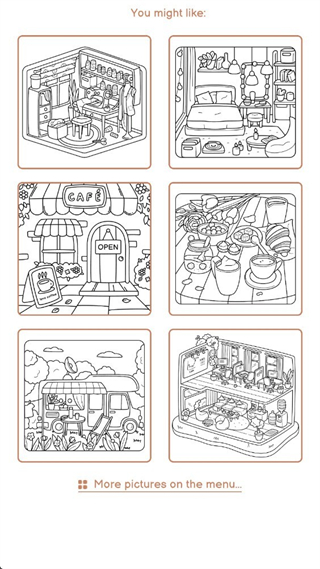 软萌的线稿线条+暖系调色盘+温馨纹理,填色过程中能直观感受到冷清线稿变温暖场景的变化,体验愉悦且放松。