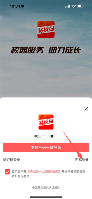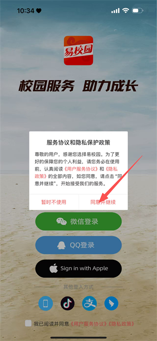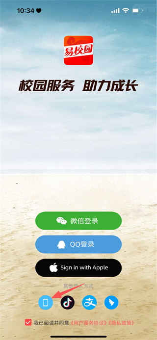 1、在易校园的服务协议弹窗中,点击同意,进入登录选择页面。