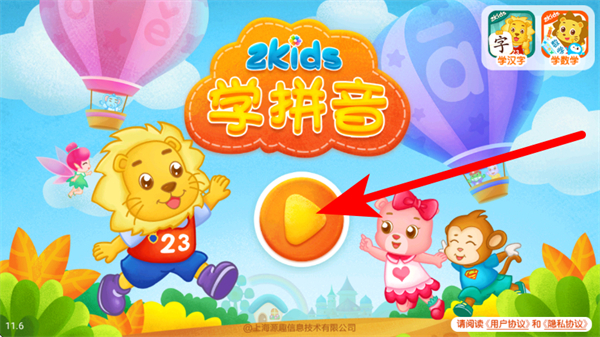 1、打开2Kids学拼音,点击首页中间的播放,进入主界面。
