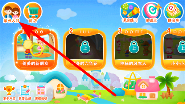 2、在主界面,点击左上角的家长入口,进入家长功能页面。