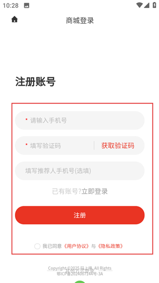 4、在注册页面,填写信息并勾选协议后,点击注册完成账号注册。