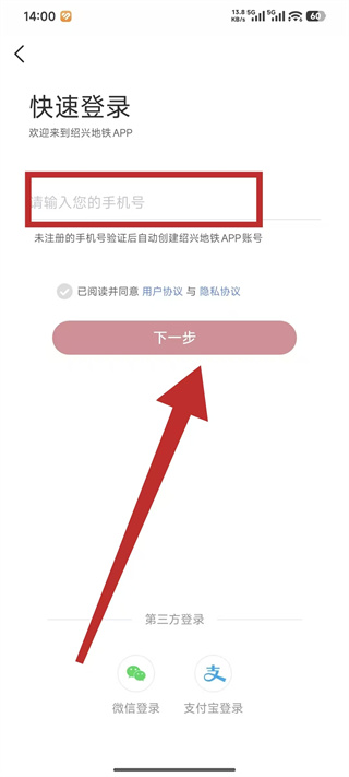 4、进入快速登录页面,填写本人手机号码,勾选已阅读并同意协议后,点击下一步。
