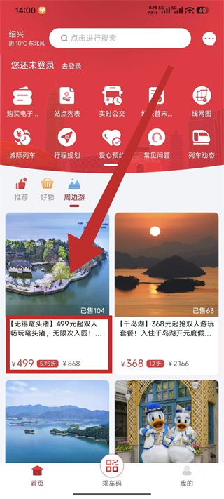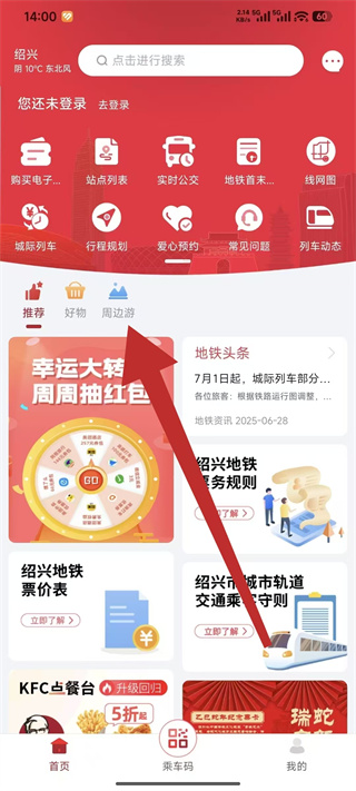 1、打开绍兴地铁APP,进入首页,点击周边游。