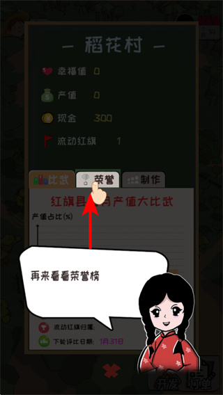 2、在村庄界面中,点击荣誉按钮查看荣誉榜信息,了解村庄的产值排名、活动日程等内容,明确经营的目标方向。