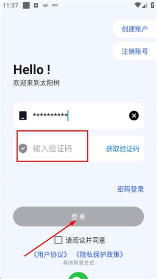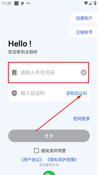 2、在登录页面填写手机号,勾选协议后,点击获取验证码。