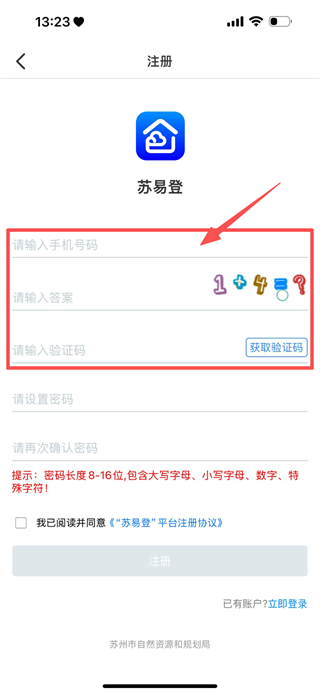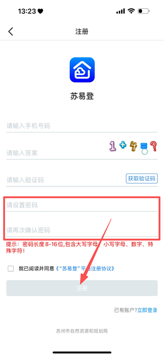 4、继续在注册页面,填写密码与确认密码,点击注册完成,苏易登账号注册。