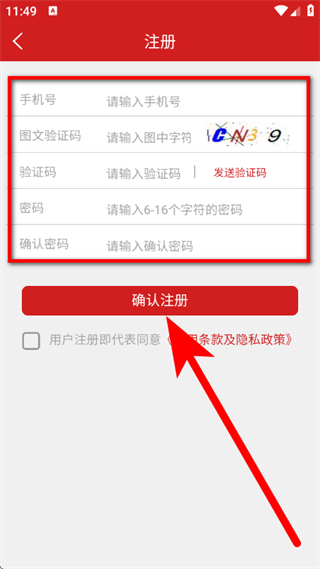 4、在注册页面,输入手机号、设置密码,勾选协议后,点击确认注册,完成注册操作。