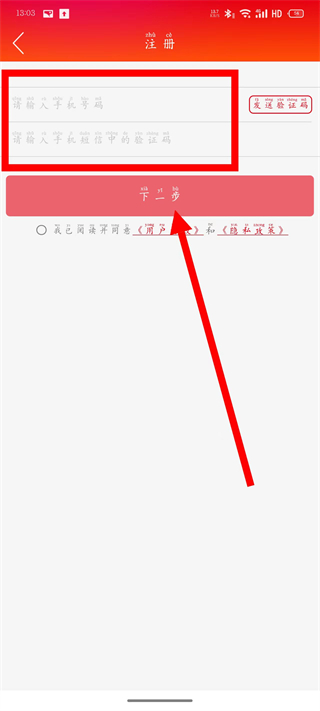 4、在注册界面,输入手机号码,点击发送验证码,完成注册。