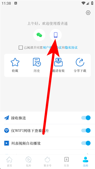 1、打开看齐通,点击首页右上角的频道,进入频道管理界面。