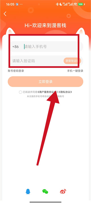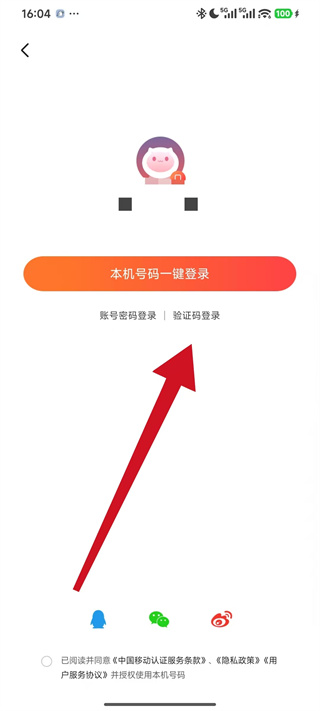 3、在登录方式选择页面,点击验证码登录,进入手机号验证页面。