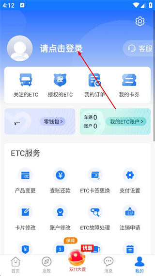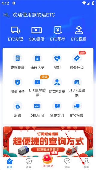 1、在慧联运ETC首页,点击底部导航栏的我的,进入个人页面。
