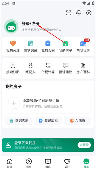 2、在个人页面,点击登录/注册区域,进入登录选择页面。