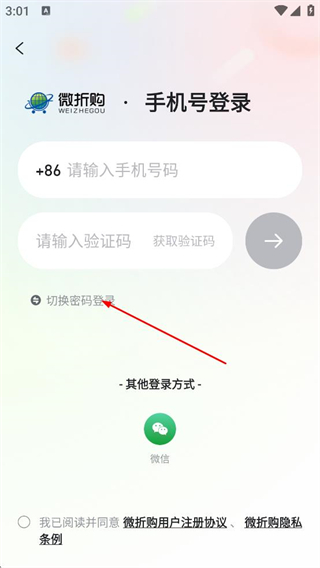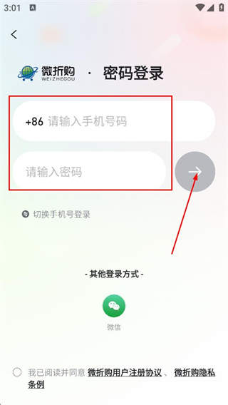4、在密码登录页面,填写手机号与密码,完成微折购账号登录。