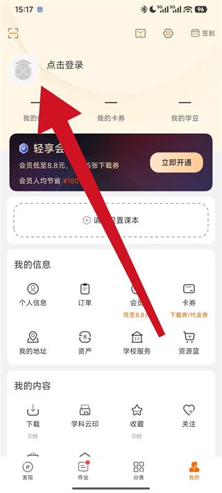 1、打开中学学科网app,点击底部导航栏最右侧的我的,进入个人中心页面。