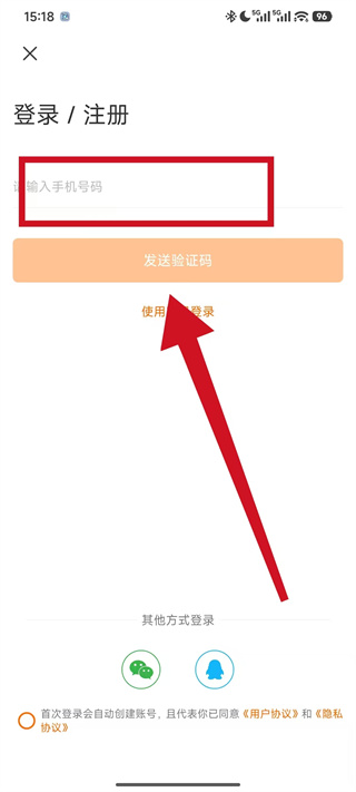 4、在登录/注册页面,填写本人手机号码,勾选我同意相关协议后,点击发送验证码。