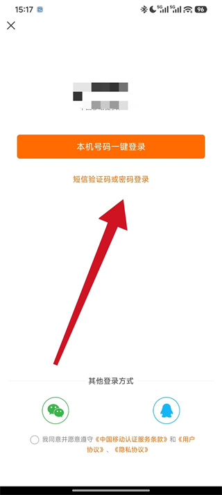 3、在登录方式选择页面,点击短信验证码或密码登录,进入登录/注册页面。
