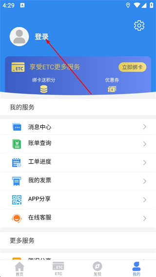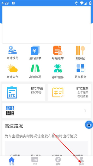 1、在湖南高速通首页,点击底部我的,进入个人页面。