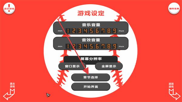 3、这是游戏设定界面,包含音乐音量、音效音量等设置项,点击章节选择按钮跳转至章节选择界面,可根据需求调整设置或切换界面。