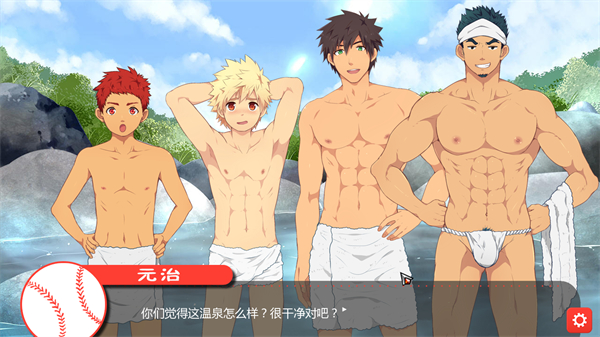 2、此为剧情对话场景,角色元治正在进行台词互动,可通过点击右下角齿轮标志按钮进入设置界面。