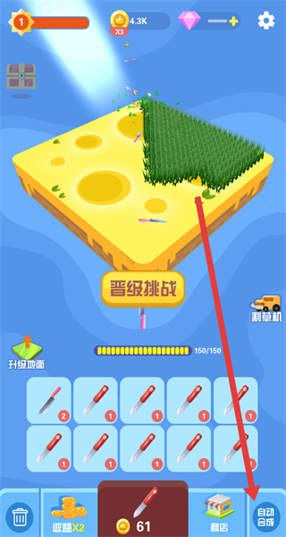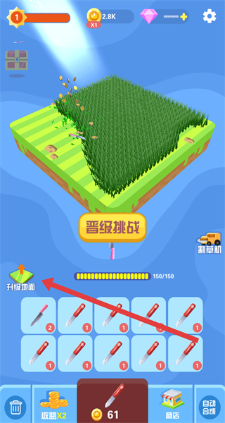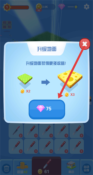 2、消耗75钻石完成地面升级,将地面收益从×2提升至×3,增加割草后的金币收益。